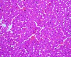 Microscopic examination of liver: Sections show liver tissue with overall preserved lobular architecture. Portal tracts are within normal limits, containing portal triad and scanty fibrous tissue. Sinusoidal dilatation and congestion is seen. No significant portal or lobular inflammation was seen. Diffuse lipofuscinosis is noted. No cholestasis. No evidence of granuloma or malignancy is seen |