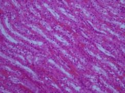 Microscopic examination of kidney: Sections show renal tissue composed of cortex and medulla. Glomeruli are within normal limits. Severe degree of ATN is seen. Vascular structures are distributed evenly. No evidence of granuloma or malignancy is seen in any of the sections examined. |