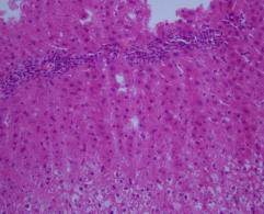 Microscopic examination of liver: Sections show liver tissue with overall preserved lobular architecture. Portal tracts are mildly expanded with lymphocytic infiltrate and minimal fibrosis. No significant lobular inflammation seen. Foci of macrovesicular steatosis are seen. No siderosis. No cholestasis. No evidence of granuloma or malignancy is seen. |