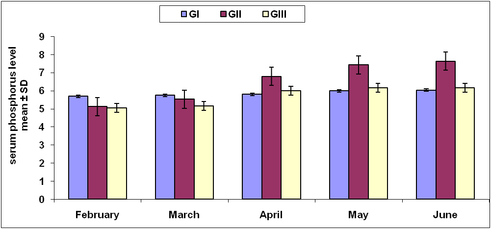 Serum phosphorus level in the three studied groups compared by ANOVA showed that in 3rd and 4th mo serum phosphorus levels were higher in group II than group I at 3rd mo (7.43+0.74) versus (5.99+0.89) with p =0.039 and 4th mo (7.63+0.69) versus (6.03+0.69) with p =0.024 respectively, with no significant change in group III than group I and group II at baseline and throughout the study. (fig. 1).