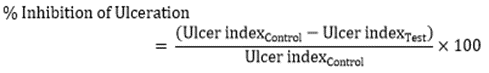 Where, UI= Ulcer Index; UN = Average number of ulcers per animal; US = Average number of severity score; UP = Percentage of animals with ulcers. Percentage inhibition of ulceration was calculated as below: