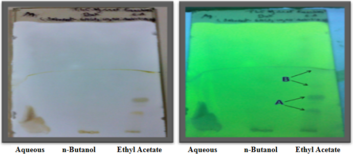 Chloroform: Methanol: AceticAcid (8:2:1) solvent system was showing two prominent major spots (A) and two minor spots (B) only for ethyl acetate fraction out of all the three fractions of BLE as shown in fig. 1.