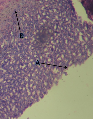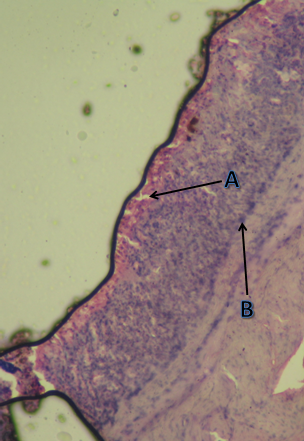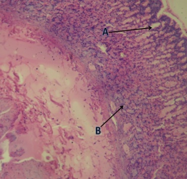 F4-chloroform: methanol (7:3) solvent system fraction (most active sub-fraction); A-Mucosal erosion; B-Inflammatory cells