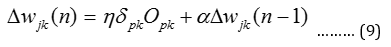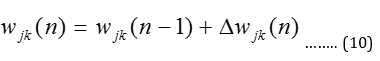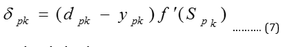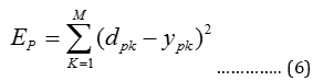 Gradient descent technique such as generalized delta rule is applied for training the network, so as the Ep minimization is achieved. This rule states that the error function dpk between the hidden layer neurons to the output layer neuron k is calculated as:
