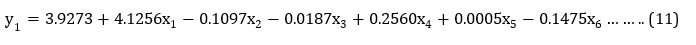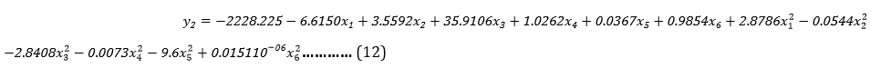 The graphical comparison of the experimental and calculated output of regression analysis is shown in fig. 1 (a). The difference between experimental and calculated output was high, which further suggested for the consideration of quadratic terms. Therefore, we again go for regression analysis after squaring the terms. After adding the squaring terms, the value of R2 obtained was 0.910, which is a good fit. y2 is the output shown in the equation developed on the basis regression modeling after adding quadratic terms mentioned below (equation 12) which is quite reliable as the value of R2 is near to 1.