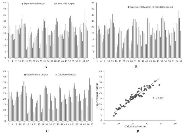 Fig. 1: (a) Comparison of experimental and calculated output after regression analysis when only linear terms were considered. (b) Comparison of experimental and calculated output after regression analysis when linear and quadratic terms were considered. (c) Comparison of experimental and calculated output after regression analysis when linear, quadratic and interaction terms were considered. (d) The scatter plot of experimental output and calculated output by the regression modeling to validate of data.