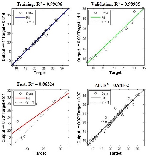 Results: The L-asparaginase activity were obtained 38.918 (U/gds) and 38.714 (U/gds) with the optimum input parameters (= Glycine max, =30 (°C), =6.5, =70 (%),=1180(µ), =30 min) by ANN, and (= 3, =30 (°C), =6.5, =70 (%),=1305(µ), =30 min) by RM respectively. The goodness of fit of the model was determined in terms of R2. The value of R2 obtained by ANN after training and validation and over all data was 0.996, 0.989 and 0.981, whereas the value of R2 obtained with linear, quadratic and full regression models was 0.501, 0.910 and 0.914 respectively.