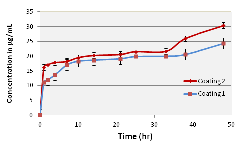 The in vitro drug release profile in 40 ml phosphate buffer saline of pH 7.4 up to 48 hrs show 30.3 µg/ml and 24.2 µg/ml (P=0.004) drug release from Coating I and Coating II, respectively. It is observed that the initial release of GS up to 1 hr is as high as 11.5 µg/ml and 16.5 µg/ml from Coating I and Coating II, respectively.Then after, there is a sudden change (decrease) in the trend of concentration of GS release. Additionally, it is also exhibited that there is again a small change (increase) in the trend of concentration of GS release. Significant different in the concentration of GS release is observed for Coating I and Coating II.