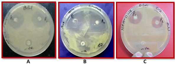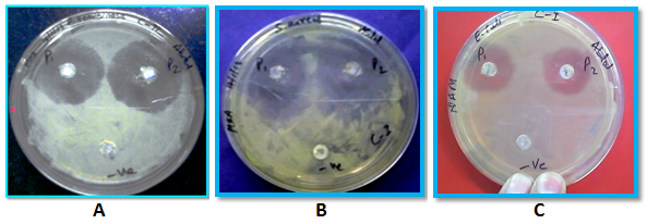 Fig. 3b: Zone of inhibition of Coating II against; (A) P. aeruginosa,(B) S. aureus and (C) E. coli.