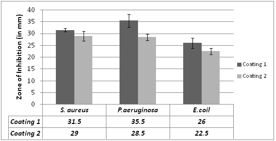 Antimicrobial properties of the coated Silicone were evaluated through agar diffusion method against three strains of bacteria namely Staphylococcus aureus, Pseudomonas aeruginosa and Escherichia coli. Coated Silicone pieces were placed in duplicate along with uncoated Silicone piece as negative control on three bacterial streaked plates. These plates were incubated at 37°C for overnight. The appearance of zone of inhibition was observed next day which was measured using a HiAntibiotic ZoneScaleTM-C (Hi Media, India) and photographs of zone of inhibition were taken for analysis.