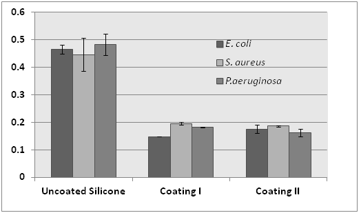 Biofilm formation assay was performed against E. coli, S. aureus and P. aeruginosa on coated and uncoated Silicone pieces with the help of XTT/Menadione reduction assay and investigated. The figure 4 shows absorbance and their deviation with uncoated Silicone, Coating I and Coating II with E. coli, S. aureus and P. aeruginosa. Biofilm formation assay shows the significant reduction of biofilm formation on coated Silicone pieces with reference to uncoated Silicone pieces.