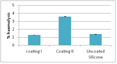 Fig. 5: Comparative study of % Haemolysis of Coating I, Coating II and Uncoated Silicone piece.