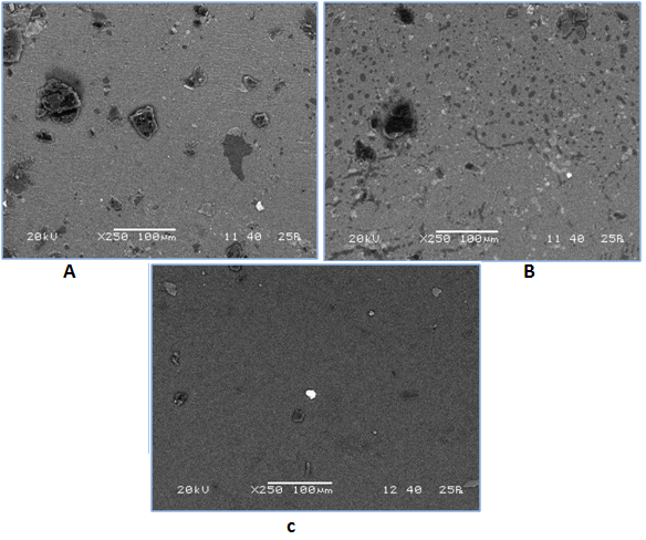 From the SEM micrograph of the surface of drug encapsulated polymer coated Silicone pieces, it is found that the clear image of uniformly coated layer without any pores is observed in figures 7a and 7b. For reference, the microscopic studies of uncoated Silicon piece is also shown in figure 7c. The SEM study showed that the drug encapsulated polymer coated Silicone piece produced a rough surface rather than a smooth one as uncoated Silicone.