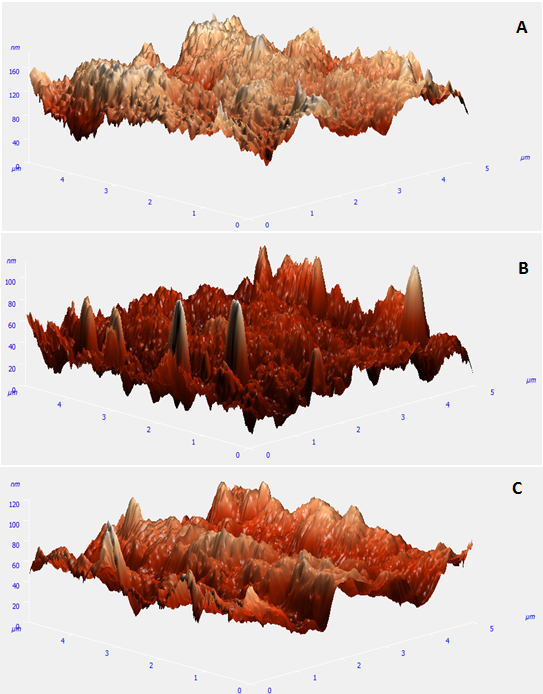 Fig. 8a: Three dimensional surface Image of AFM at 5x5 µm surface area. A: Coating I, B: Coating II and C: Uncoated Silicone