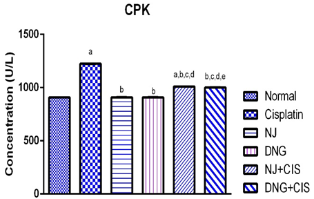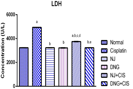 A single dose of CIS (5.0 mg/kg b. wt. i. p.) in group-II, caused significant (p<0.001) elevation in the level of serum biochemical markers (LDH, CPK, and urea). Co-administration of NJ and DNG (0.35 ml/mouse p. o.) respectively induced significant (p<0.001) reduction in the elevation the above biochemical markers in CIS challenged mice (Group-V and VI). Whereas NJ and DNG respectively (Group-III and IV) showed no significant difference compared to normal (Group-I), (fig. 1).