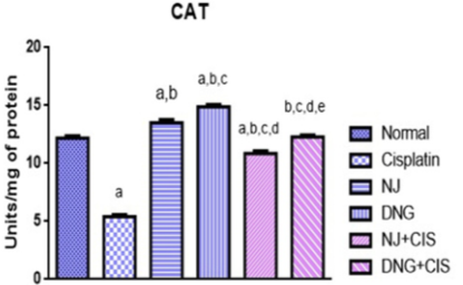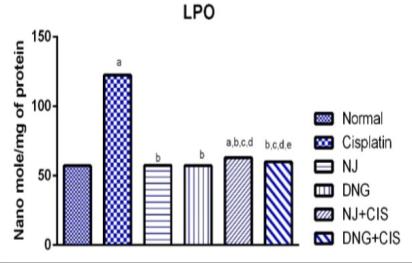 Conclusion: NJ and DNG possess protective effect against CIS-induced cellular damage in the kidney by decreasing the level of serum biochemical markers, enhancing the level of enzymatic and non-enzymatic antioxidants and maintaining the LPO level. Results suggest that NJ and DNG have strong nephroprotective effect against CIS-induced nephrotoxicity.