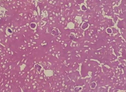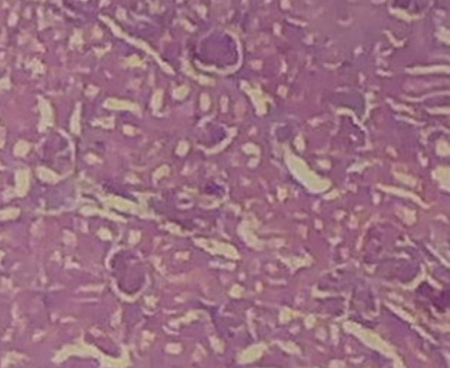 The normal kidney section (fig. 3; A.) revealed normal histology of glomerulus, distal and proximal convoluted tubules and normal orientation of nephrons. Similar results were obtained in the treatment of NJ and DNG (0.35 ml/mouse p. o.) respectively in normal mice (fig. 3; C, D). Light microscopic observations of CIS at the dose of 5.0 mg/kg b. wt. i. p caused necrosis and thickened blood vessels. The dead and inflammatory cells were increased, also glomerular and tubular congestion was observed (fig. 3: B).