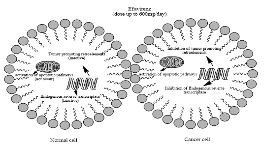 Fig. 1: Effect of Efavirenz at a lower concentration in normal and cancer cells. In normal cells, efavirenz produces tolerable damage but in cancer cells, efavirenz inhibits the endogenous reverse transcriptase, tumor promoting retroelements along with activation of apoptotic pathways which provide a new hope as anticancer agent. fig. has been drawn by Bio Chemdraw.