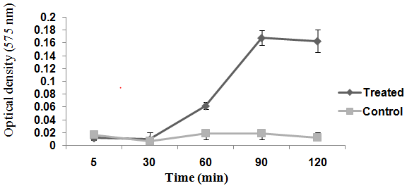 In case of E. coli also there was an increase in the formation of Formazan blue confirming enhanced ROS production with time, showing the maximum optical density (OD) in 60 min. The control cells showed a negligible increase in oxidative stress in both S. aureus and E. coli (fig. 1b). Means of treated bacterial cells are significant compared to untreated control, as analyzed by Student’s t-test (p<0.05).