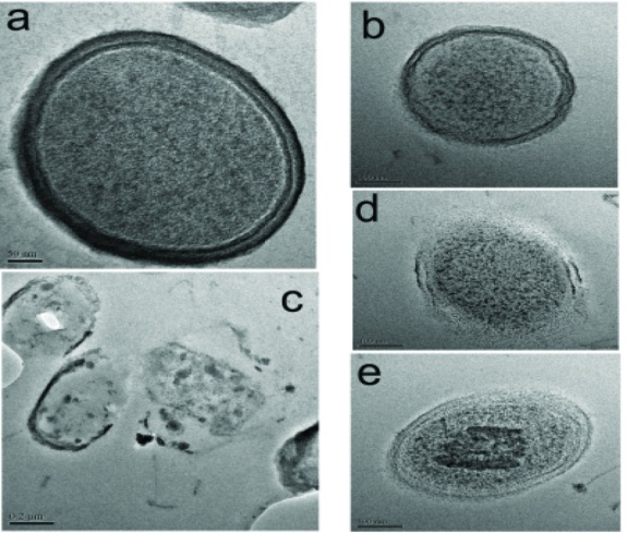 (a) Untreated bacteria. (b) After treatment with CHF extract, there is the disintegration of cell wall and cell membrane, leakage of cytoplasmic content. (c) Complete lysis of some cells after treatment. (d) and (e) some cells are lacking cell wall after treatment