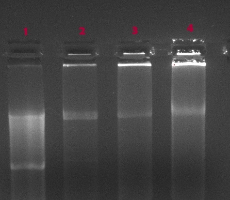 Fig. 4: Plasmid DNA bands analyzed by gel electrophoresis. Lane 1: Control DNA isolated from S. aureus, Lane 2: DNA isolated from S. aureus cells treated with L. salicifolia extracts for 30 min, Lane 3: DNA isolated from S. aureus cells treated with extracts for 60 min and Lane 4: DNA isolated from S. aureus cells treated with extracts for 90 min