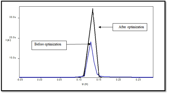Carvedilol was electrochemically oxidized using glassy carbon electrode (GCE) [8]. In this study the reduced polarographic wave was determined using HMDE as a working electrode, the optimized condition was determined listed in table 1, Polarographic wave recorded before and after optimization (fig.1), showed a peak at E1/2 0.148 V and id 36.4µA.