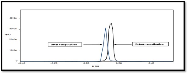 The ability of drugs to exert a biochemical and/or biophysical modification in cellular activity depend mainly on its ability to interact with cellular receptors (macromolecular structures located intracellularly or on the cell surface). This interaction could be achieved by binding of drugs to the cellular surface receptors, nucleic acids or enzymes, which will be reflected the formation of drug-receptor complex which leads to a biologic response. The selectivity of the receptor is mainly determined by the drug receptors interaction involves the formation of chemical bonds, mainly electrostatic and hydrogen bonds, as well as weak interactions involving van der Waals forces. These bonds are important in determining the selectivity of receptors because the strength of these noncovalent bonds is related inversely to the distance between [3]. In DPP the current is measured in two intervals of about (15 ms), the first immediately prior to the potential pulse and the second during but towards the end of the potential pulse. The final current signal displayed is, in fact, the difference of these two current values [4]. The two current values represent the current at two potential values separated by about 10-100 mV (the pulse amplitude). This difference in current will be greatest on the steep rising part of the polarographic wave around the half wave potential, where a small change in potential produces a large change in current.