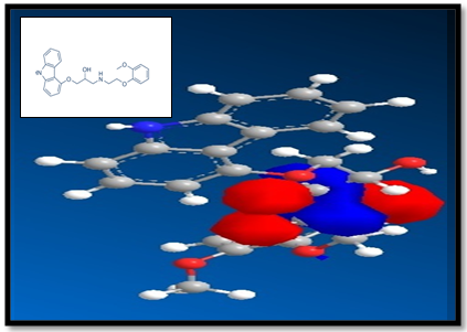 Carvedilol was studied theoretically to make a true based scientific comparison between theoretical and experimental complication study. However, carvedilol has a HOMO molecular orbital figure. 8, which indicate that HOMO orbital is at the core of the compound. So, the interaction with the receptor is certainly from the core.