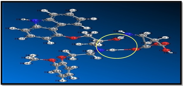 Carvedilol interaction with aspartic acid, which has HOMO orbital shown in (fig. 9), hydrogen bonds were made between CRV and Asp. (fig. 10), to achieve the interaction, (fig. 11)