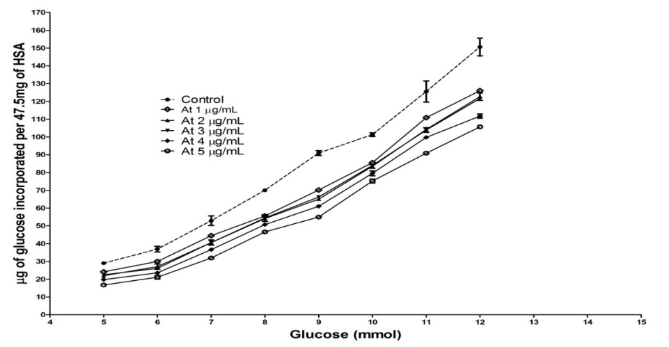 The rate of MET incorporation into rHSA was independent to the incubation period. Whereas, incorporation of glucose to rHSA was concentration depended. In cases of glucose binding, the incubation of glucose to rHSA was incorporation was linear and time dependent, whereas, glycosylation of rHSA was affected by MET in a concentration and time independent manner as shown in fig. 5.
