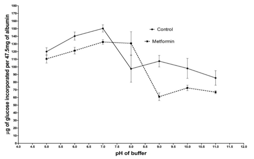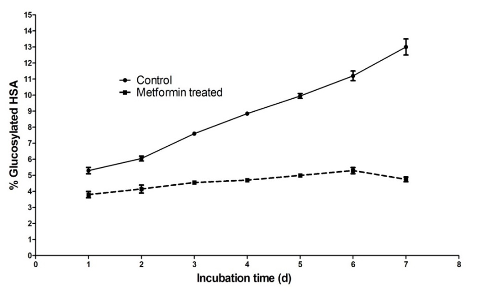 The laboratory mixture for rHSA (Fraction V; 47.5 mg/ml) solution was prepared in 10 mM phosphate buffer (pH 7.4) with0.2% (w/v) sodium azide and D-(+)-glucose corresponding to plasma concentrations ranging from 5-12 mM. Following the addition of D-(+)-glucose, MET was added to its plasma concentration range from 1-5 µg/ml. The laboratory mixture was incubated for upto7 d in capped, sterile vials at 37 ° and 20 RPM in envirogenie® metabolic shaker. The pH of the reaction solutions was varied from 5.0-11.0 and difference in glycosylation was observed at 10 mM glucose concentration correspondence to plasma concentration of MET (5 µg/ml). At the end of each incubation period, 1-ml samples were removed and dialyzed against several 1000-fold volumes of distilled water for 24 h at 4 °. The remainder was lyophilized and stored at-20 °. A portion of the dialysate was monitored for the presence of free glucose by the glucose oxidase method. The remainder was lyophilized and stored at-20 °. Incubated samples were compared to control samples which were prepared and incubated for same time period by dissolving identical quantities of albumin incubated with glucose in phosphate buffer and dialyzing against distilled water for 24hr [21].