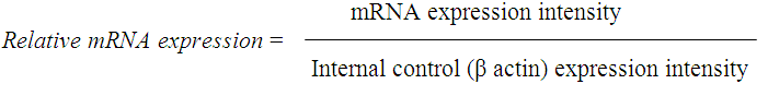 The PCR products were analyzed on 2% agarose gel andvisualized by ethidium bromidestaining.Reverse transcription polymerase chain reactions were done using the PCR iCycler (BioRad). Analysis of cDNA intensity byImage J Imaging System software (v 1.24; National Institutes of Health, Bethesda, MD). Relative mRNA expression was calculated using following formula: