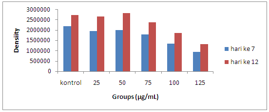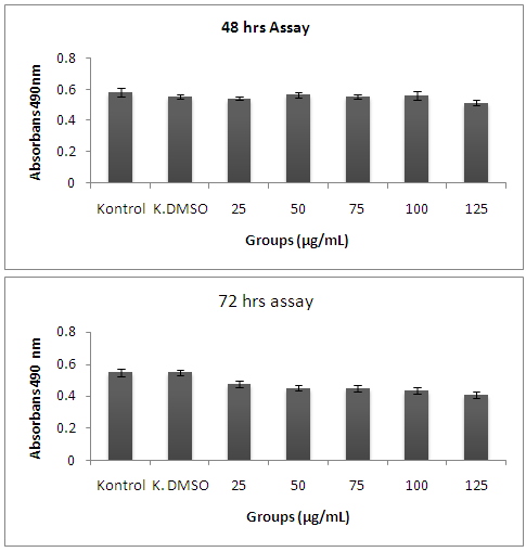 The results of toxicity tests showed that the extract have no toxicity after 48 hours. The number of living cells began to decrease after incubation with the extract for 72 hours. Reduced number of living cells is directly proportional to the increase in concentration of the extract. MTS assay results are presented in Figure 2