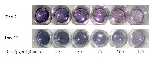 According the data, it can be seen that the amount of alkaline phosphatase is time dependent if we compare day 7 to day 12. However, theytend to decrease the amount of alkaline phosphatasewith the increasing of dose. It can be concluded that the reduced number of alkaline phosphatase caused by the reduced number of living cells induced toxicity extract increases with increase in dose and increasing incubation time in the cell extract