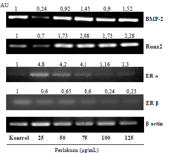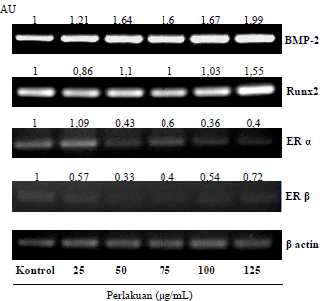 In Figure 5, can be seen that the relative expression of Runx2 is directly proportional to the BMP-2 but inversely with ER α. ER β expression tends to decrease with increasing concentration of the extract but no apparent correlation between Runx2, BMP-2, and ER α.BMP-2 induces osteoblast differentiation through increased expression of Runx2. While the process of bone formation occurs through ER α but not ER β (Lee, Kim, & Choi, 2012; Hertrampf et al., 2008; Nakamura et al., 2007, Manu, 2004; Wiren, Evans, & Zhang, 2002). Runx2 expression is inversely related to the expression of ER α because according Jeong et al (2010), expression of ER α inhibit Runx2 transactivation (Jeong et al, 2010).