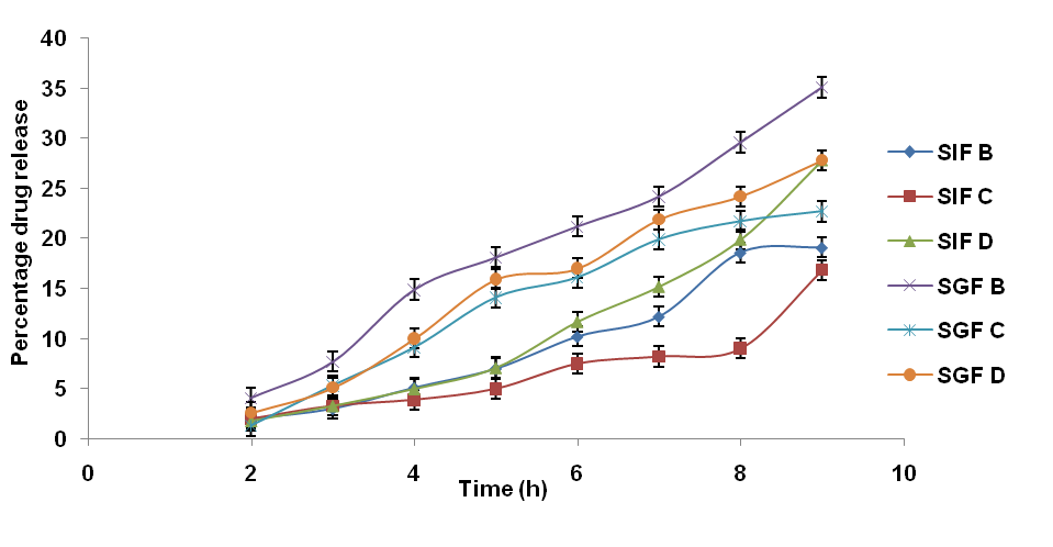 Fig. 1: Release profile of gentamicin from the microparticles in SIF and SGF, n = 3; the presented results are the average of three (3) determinations