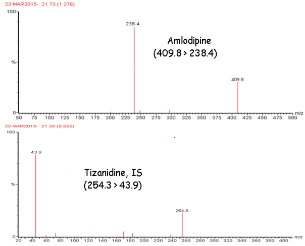 Fig. 1 depicts the chemical structure of amlodipine and tizanidine, the internal standard (IS) used in the study. The mass spectrometric conditions were optimized by infusing a standard solution of the amlodipine and the IS with a syringe pump. Precursor and product spectra of amlodipine and IS are shown in fig. 2. The product ion transitions response were quantitatively measured as peak height at m/z 409.8 → 238.4 for amlodipine and 254.3 → 43.9 for the IS. The chromatographic conditions were optimized using mobile phase composed of 10 mM formic acid and acetonitrile (20:80, v: v) at flow rate 0.3 ml/min. Data were recorded in multiple reaction monitoring (MRM) mode.