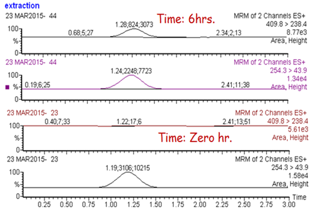 Fig. 5: MRM chromatograms of plasma samples obtained from a healthy volunteer before and 6 h after single 10 mg oral amlodipine dose