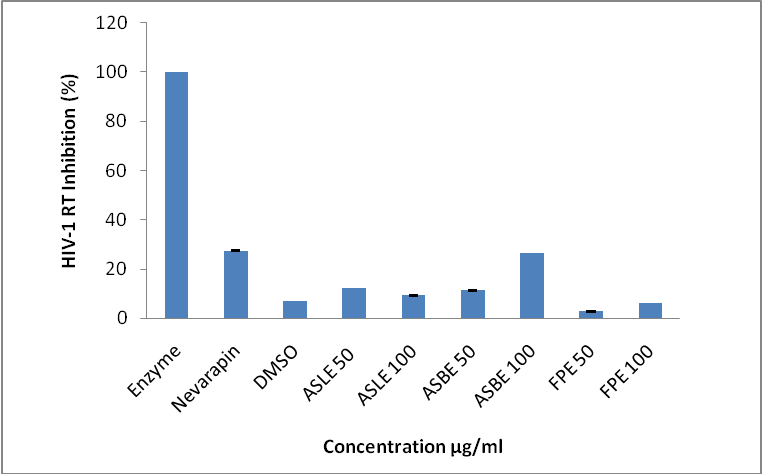 The positive control used was nevirapine (Aspen Pharmacare, South Africa), which is one of the most common reverse transcriptase inhibitors used in clinical practice. The HIV-RT inhibition of methanolic extracts was measured as a percentage of the inhibition that occurred with HIV-1 RT in the presence of no inhibitor in the same solvent (2% DMSO) as the extracts.