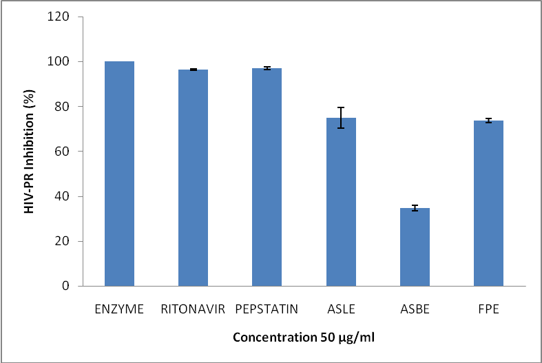 In the case of HIV-protease assay, leaf extract and fruit pulp extract (50 µg/ml) has shown quite high inhibition (≥ 50%) to the extent of 75% and 74% respectively which is very significant. The root bark extract has shown 35% inhibition.