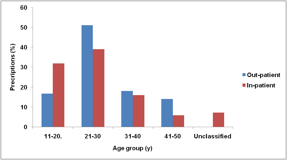 At the end of this study, a total number of 2634 cases of pregnancy were recorded. 215 (8.2%) outpatients and 69 (2.6%) inpatients presented with conditions that necessitated prescription of drugs. In both groups, age group 21-30 presented the highest number of cases with prescription (fig. 1).