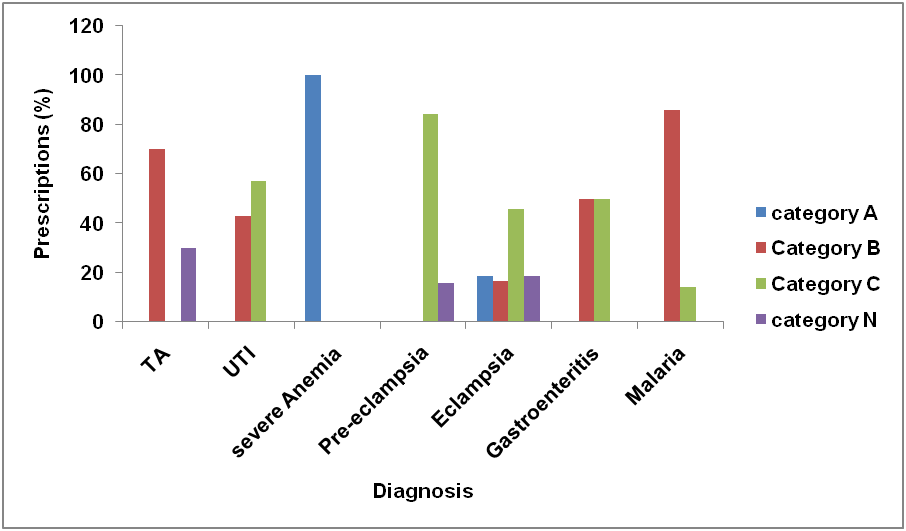 For UTI, 42.9 and 57.1 of drugs prescribed were grouped into categories B and C, respectively, while for severe anemia, 100% of prescribed drugs were from category A. For Pre-eclampsia, 84.21 and 15.79% of prescribed drugs belong to category C and N, respectively. For eclampsia, 18.8%, 16.6%, 45.8% and 18.8% of medicines prescribed were from categories A, B, C and N, respectively. For gastroenteritis, equal amount (50%) of prescribed medicines were drawn from categories B and C (fig. 4).