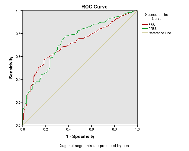 The FBS and PPBS were plotted against HbA1C values showed moderate correlation. Pearson’s correlation co-efficient was 0.528, p<0.001 for FBS and 0.510, p<0.001 for PPBS. Regression analysis showed a significant relation between fasting and postprandial sugar level with glycosylated hemoglobin levels (p<0.001). For validating this regression test, Receiver operating characteristic (ROC) curve was plotted (fig. 1). The results showed that the sensitivity, specificity, positive predictive value and negative predictive value of postprandial glucose level were better than the fasting blood glucose level (table 2).