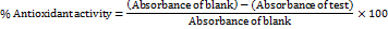 Aluminum chloride colorimetric technique was used for Flavonoids estimation [36]. 0.5 ml of the Sample was mixed with 1.5ml of methanol, 0.1 ml of 10% aluminium chloride,0.1 ml of 1 M Potassium acetate and 2.8ml of distilled water. It was left at room temperature for 30 minutes, after which the absorbance of the reaction mixture was measured at 415 nm with a double beam UV-Visible spectrophotometer. The total flavonoid in the test sample was determined by extrapolating the calibration graph using Quercetin as the standard. Total flavonoid content was expressed in quercetin equivalents (QE).