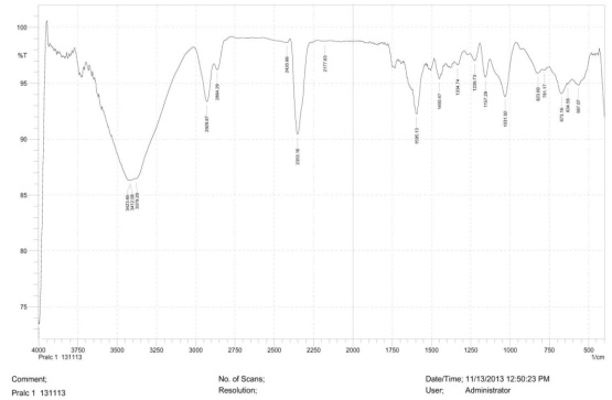 The peak 1595 cm-1 corresponds to asymmetric C=O frequency and to the overtone frequency of N-H bonds. The Peak at 1450cm-1 corresponds to asymmetric C=O, C-N of amines. The Peak at 1337cm-1 indicates the presence of symmetric C=O, Symmetric C-H, N=O bonds. Peak at 1031cm-1 corresponds to fundamental C-C bond peaks. In general FT-IR Spectrum of the sample shows the presence of fundamental vibrations such as aromatic C-C, C-H, C-O, N-H and O-H bonds[38] which correspond to the presence of alcohols, acids, esters and aliphatic amines. These groups are responsible for the biological activity of the sample.