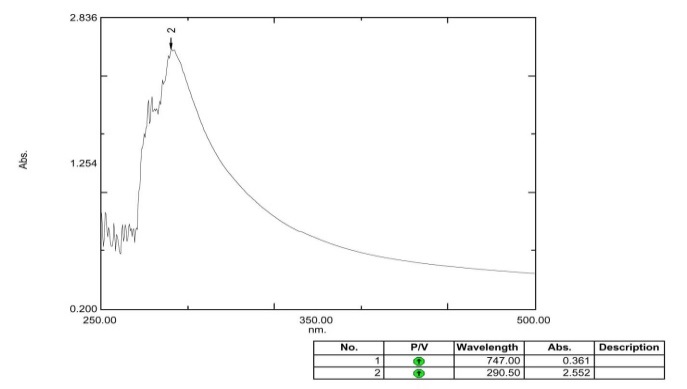 A strong absorption peak at 290.50nmis attributed to the presence of phenols and flavonoids. The higher absorbance value indicates the rich composition of polyphenols and flavonoids in the sample. From the absorbance value, quality of the stingless bee propolis sample can be assessed[6]. The total polyphenol content in the sample was determined by Folin-Ciocalteu’s method using Gallic acid as the standard[35] and the total Flavonoid content in the sample was determined by Aluminium Chloride Colorimetric method using Quercetin as the standard[36]. The results of the study are given in Table 1.