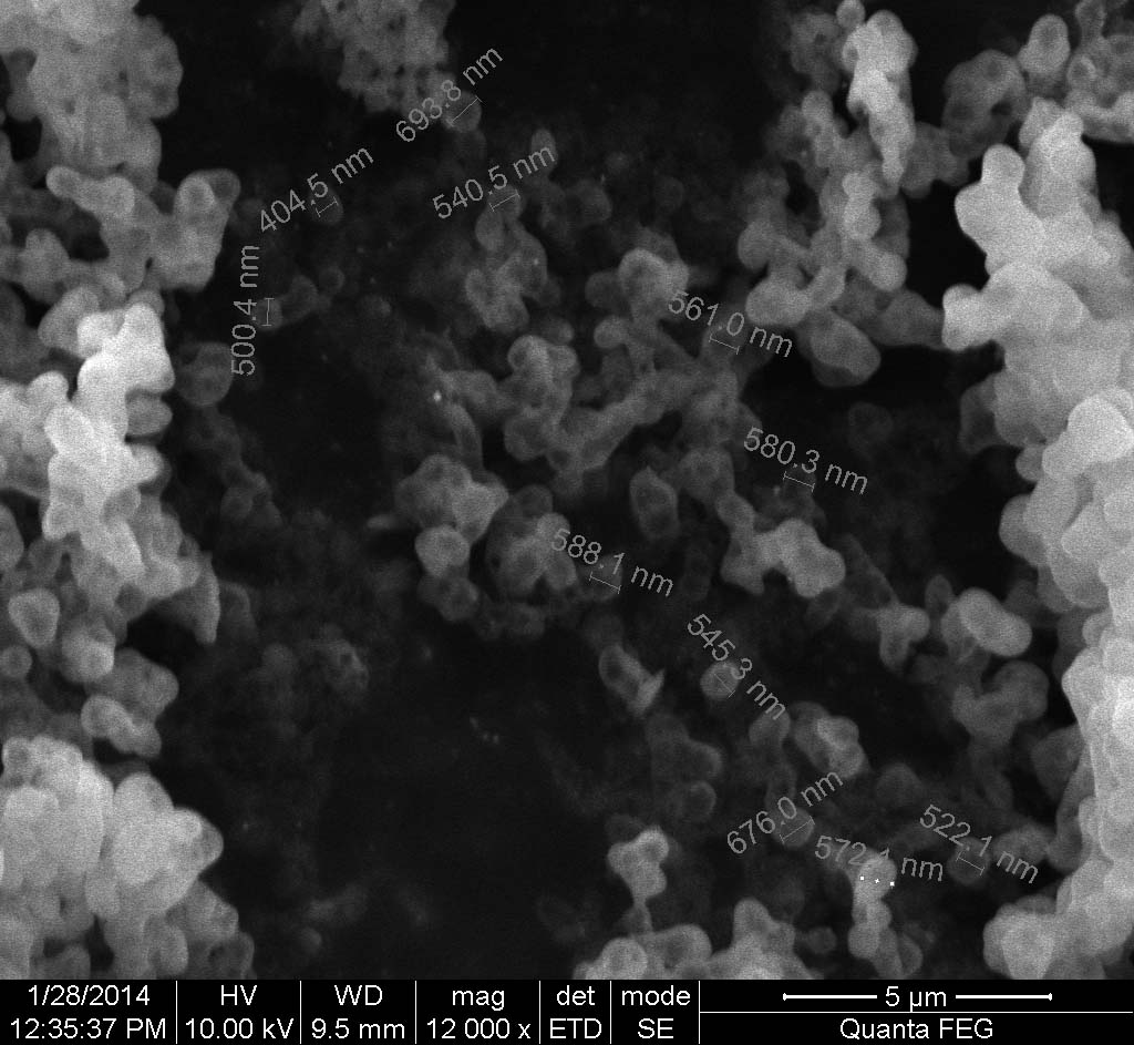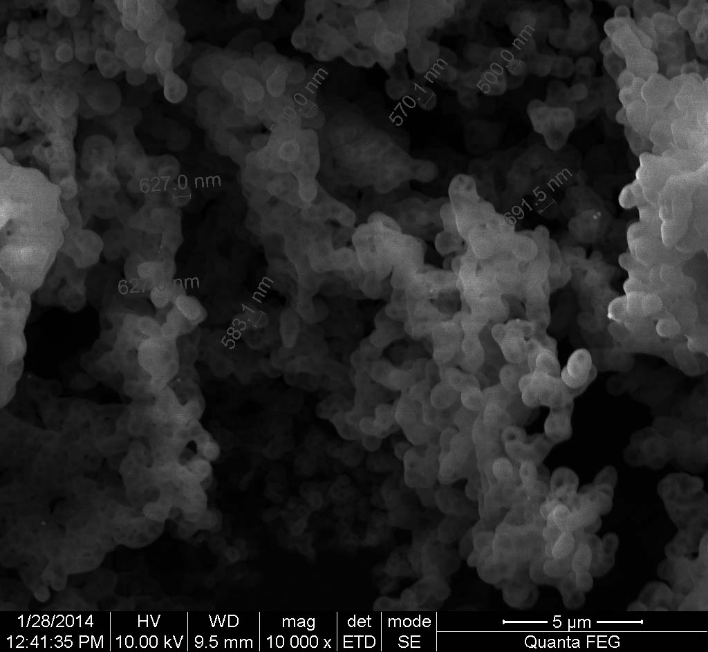 A thin film of the sample was prepared on a carbon coated grid by just dropping a very small amount of the sample on the grid, extra solution was removed using a blotting paper and then the film on the SEM grid was allowed to dry by placing it under mercury lamp for 5 minutes.