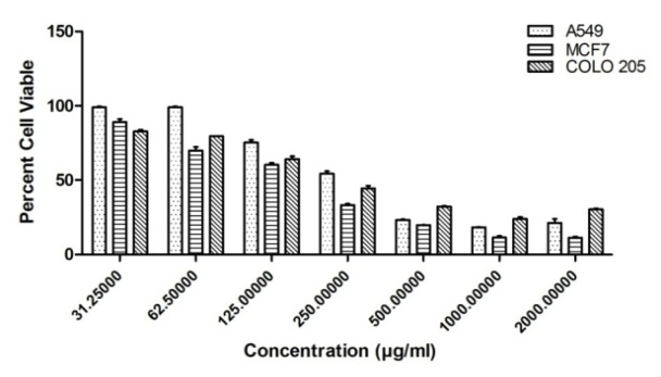 Fig. 1: In vitro cytotoxic activity of M.E.-MA on three human cancer cell lines in dose dependent manner