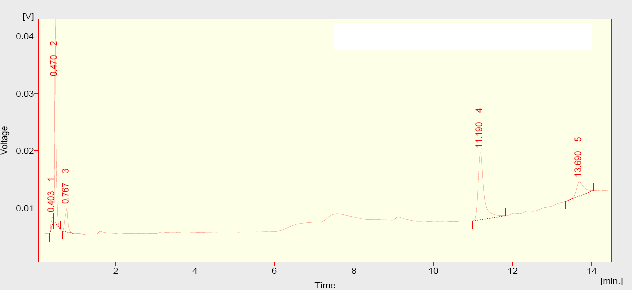 A gas chromatograph (Agilent Technologies 7890 A) equipped with FID (Flame ionization detectors) connected to Agilent G1888 Headspace sampler and a data processor Agilent technologies EZChrome Elite software version 3.2.1 was employed. Under the standard conditions, a 30 m long HP-1 column, 0.53 mm in inner diameter and 1.8 µ in film thickness (Agilent Technologies, USA) was used. The injection ports were heated at 200°C while the temperature of detector was maintained at 250 °C. The sample was introduced in the column in a split mode with split ratio, 1:5. Nitrogen, the carrier gas was allowed to flow at a rate of 1.0 ml per minute. The column (oven) temperature was kept at 80 °C for 2 min followed with an increase in the temperature at a rate of 10°C per minute to 150°C. Headspace equilibration temperature was kept at for 45 min. The reference solution contained 1000 ppm of Methanol (HPLC grade) in Dimethyl Sulphoxide (DMSO, Extrapure AR grade). Sample contained accurately weighed 100mg of M.E.-MA extract in 10ml of DMSO.