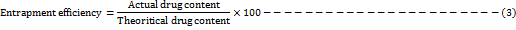 The efficiency of drug entrapment was determined spectro-photometrically (λmax 231 nm) using the dispersion containing microcapsules equivalent to 25 mg of ramipril in phosphate buffer (pH 6.8). The following equation-3 was used to calculate the drug entrapment efficiency [23].